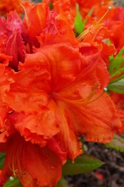 Introduced in 1947, ‘Gibraltar’ is an extremely reliable cold hardy Exbury Azalea that displays large clusters or lightly fragrant glowing tangerine-orange to deep orange flowers with exquisitely ruffled petals that light up the garden in mid to late spring, depending on your location. A loyal and gorgeous deciduous Rhododendron that puts on an absolutely stunning color display in the spring garden!