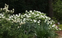 Growing in a natural looking mound to only 3 feet tall and 7 feet wide, we thing the Suwannee Squat Dwarf Flowering Dogwood is best used as a special specimen in a shady to partially shady spot. In larger spaces it can be planted in groupings or staggered rows along a woodland borders. In southern USDA Zones 8 and 9 we suggest some shade or filtered sun during the afternoon hours. Nice around outdoor sitting and living spaces where it is sure to be a conversation piece and the pretty flowers can be enjoyed from close up. A fine addition to woodland gardens, native plant gardens, white theme gardens, perennial shade gardens, and cottage gardens.